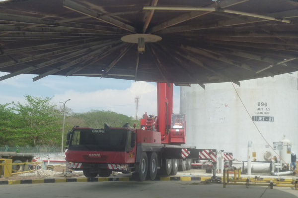 Desmantelamiento de tres tanques en forma controlada, con recuperación de las láminas, embalaje y transporte de los tanques desmantelados desde el aeropuerto Ernesto Cortizzos hasta la planta de Energizar en Cartagena.